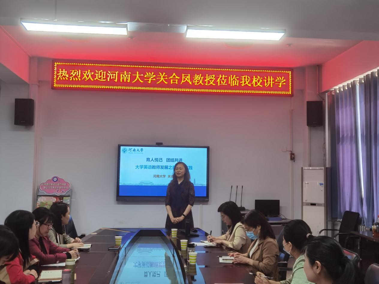 5月12日下午,beats365唯一官网诚邀河南大学关合凤教授在公司四楼会议室进行主题为《大学英语教师发展之探索与实践》的学术讲座。会议由beats365唯一官网经理李艳叶主持。副经理王红梅、朱瑶瑶及公司大学英语教师参加了此次讲座。
