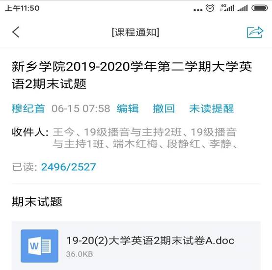6.根据教务处期末考核会议精神,各课头教研室在充分调研的基础上,达成共识,形成大学英语2、大学英语4期末考核方案。课头教研室主任积极与教务处网络教学平台技术负责人沟通后,建立各课程的云考场并多次进行模拟测试,确保线上考试顺利进行。各教研主任在规定的考试时间准时在线发布试卷、处理好考试过程中出现的各种问题。考试结束后按照大学英语统一阅卷要求做好试卷批阅、成绩和考试附件导出存档、成绩录入系统、试卷分析、装档等一系列考务工作。