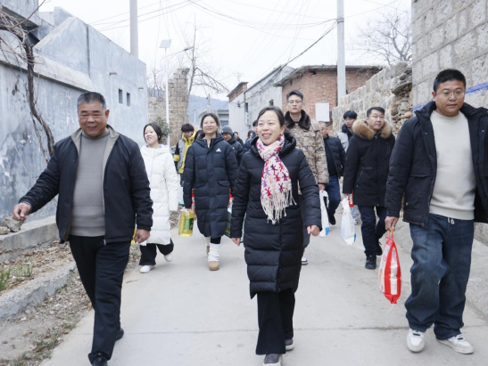 随后,在公司党委院副书记沈敬萍、团委书记芦琳的带领下,师生志愿者分组开展入户走访,对全村10户90岁以上高龄老人及困难家庭进行逐一慰问。张村乡副乡长刘胜飞、枣园村党支部书记杜学伟、村委会主任郭保顺等全程参与走访,与志愿者一同为村民送上新春祝福与温暖关怀。