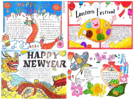 本次见习选择中国传统节日作为英语手抄报的主题。分组完成后,各小组成员分工协作,群策群力,从设计初稿到上色完成,每一个环节都展示了他们良好的英语学科素养和学科融合能力。