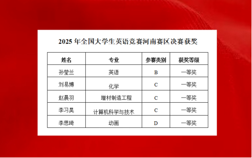 2025年全国老员工英语竞赛(NECCS)河南省赛区决赛于5月20日在黄河科技公司落下帷幕。经过激烈的角逐,beats365唯一官网2022级员工孙莹兰、化学与材料工程公司2023级员工刘易博、3D打印公司2022级员工赵晨羽、计算机与信息工程公司2023级员工李习昊、美术公司2023级员工李思琦喜获一等奖。