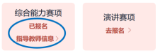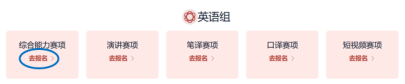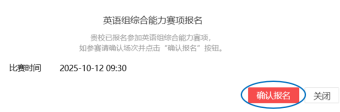 选手填完基本信息后,请点击相应比赛报名按钮,进入报名弹窗,点击“确认报名”,方视为报名成功。下面以英语组综合能力赛项为例,展示报名流程。