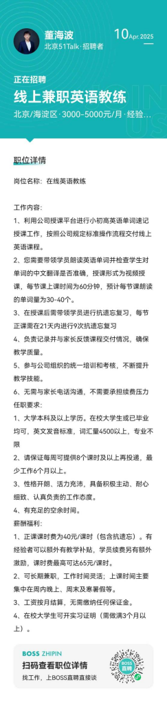 1、大学本科及以上学历。在校老员工或已毕业均可,英文发音标准,词汇量4500以上,专业不限